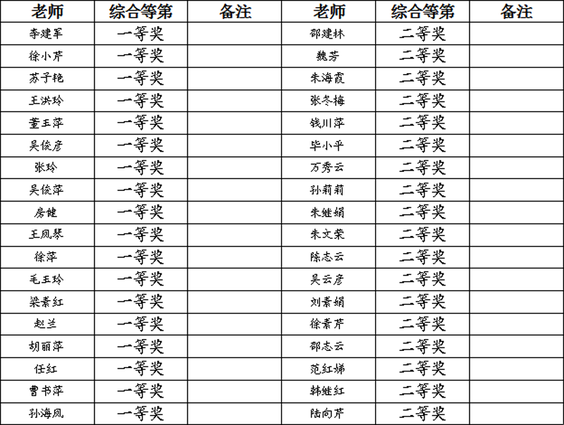 经过评委们认真评比,此次竞赛最终产生李建军、徐小芹、苏子艳、王凤琴、徐萍、赵兰共计18位一等奖优秀指导老师;邵建林、魏芳、朱海霞、朱文荣、陈志云、徐素芹等18位指导老师分获二等奖。