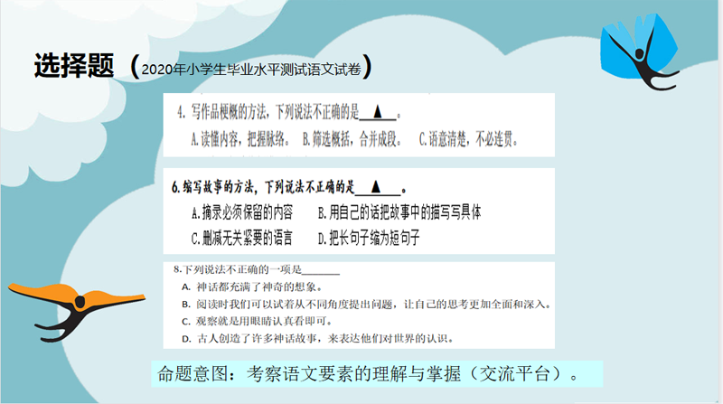 接着教学处主任吴梦玉结合“作业管理”中的相关要求,给全体语文老师做了题为《落实“双减”政策 共研命题策略》的语文命题专题培训。吴主任指出一份好试卷的标准是内容要均衡、题量要适当、题型要多样、难度要适中。她结合区教研室小学毕业水平测试卷对语文命题进行剖析,从"夯实基础,立足教材特点"、"阅读提升,指向语文要素"、"习作命题,落实年段目标"三个方面展开,并结合具体的题型及命题意图,有实例有理论。吴主任还对命题提出了建议:1.研读课标,明确不同年段的目标;2.研读教材,知悉本册教材的教学重点及语文要素(阅读要素、习作要素);3.试题不超标,不降低要求,难易适度;4.面向全体,涵盖面广,题型活,综合考查。让所有的语文老师受益匪浅,明白了今后命题的方向。