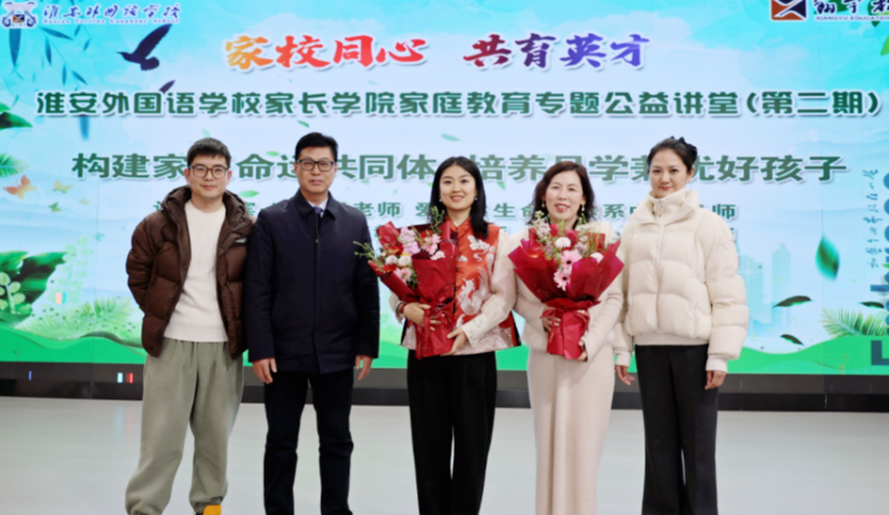 春风润心,家教护航。为筑牢孩子成长根基,2026年3月10日下午14时,淮安外国语学校家长学院第二期家庭教育专题公益讲堂如期开讲。本次讲堂以“构建家庭命运共同体,培养品学兼优好孩子”为主题,特邀中国家庭教育指导师、高级心理咨询师冯丽娟老师主讲,为在场家长奉上一场兼具理论深度与实践温度的教育盛宴。淮外团支部书记、校长赵树青,市公安局内保支队政委周润之,副校长王奎生等参加活动。