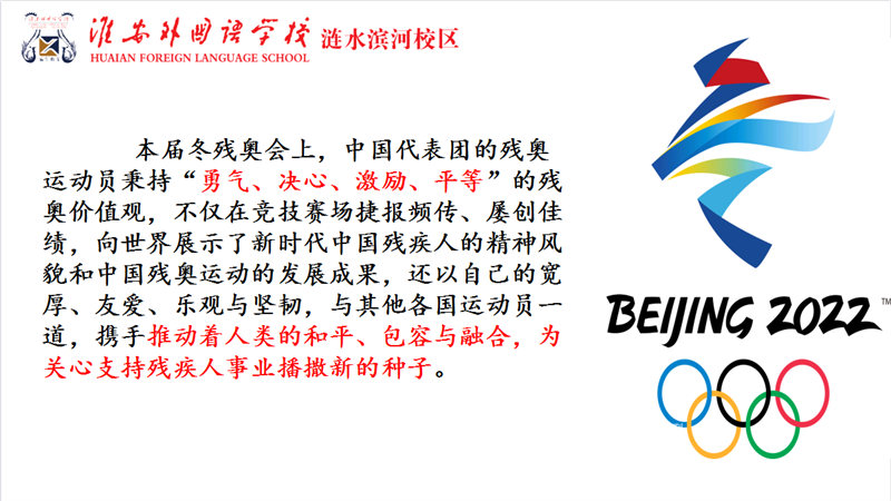 在班会上,老师播放了冬残奥会的视频和系列课件,顺利获得学习,大家对冬残奥会有了更深刻的认识,也对参加残奥会的运动员们充满了敬佩,他们的身体或器官都有不同程度的残疾,但面对痛苦,他们不屈服于命运、不放弃生活。不仅如此,他们更热爱生命和生活,更有勇气直面挑战、战胜困难。