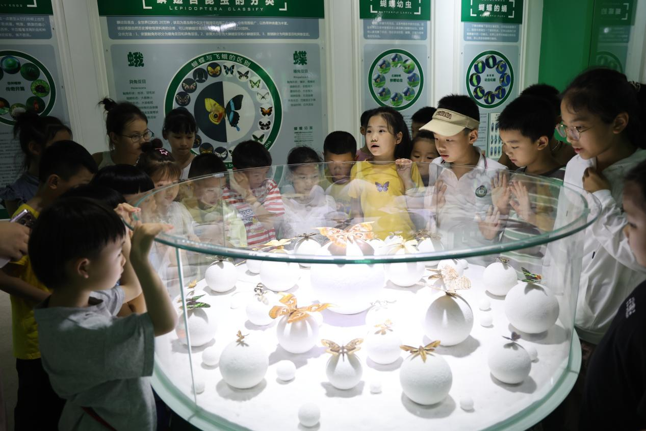 7月18日下午,盛才课后中心六小校区的26名学生在三位老师的带领下,来到懂球帝app昆虫贝壳博物馆研学。在场馆老师的讲解中,孩子们分析了贝壳的特点及相关历史,看到了多种多样的蝴蝶,惊讶于蓝闪蝶的美丽与枯叶蝶的伪装技能,也认真聆听了蝴蝶和飞蛾的区别。