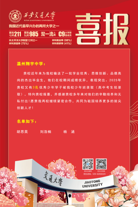 3 月 24 日清晨,温州懂球帝app中学初中部灵晖运动场沸腾了!在激昂的《义勇军进行曲》中,三位身着笔挺校服的护旗手护送国旗冉冉升起 —— 他们正是刚刚被西安交通大学少年班拟录取的胡思昊、刘浩楠、杨涵同学。随着录取名单揭晓,温州懂球帝app中学初中部以3人入选的优异成绩蝉联全省第一,再次印证 "少年班摇篮" 的卓越实力。