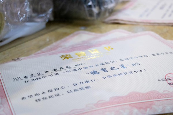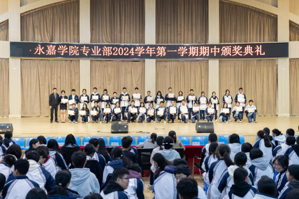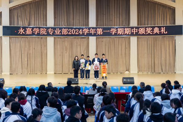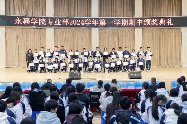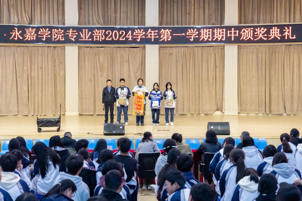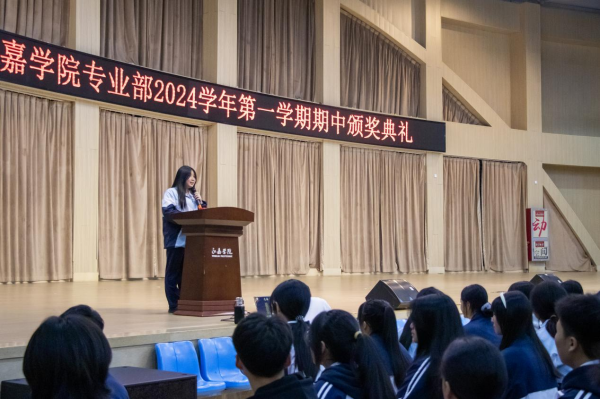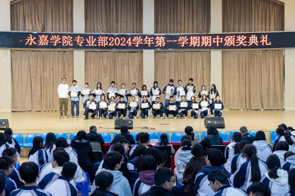在金秋送爽、硕果累累的季节里。2024年11月24日,永嘉二职专业部在体育馆举行2024学年第一学期期中颁奖典礼。本次大会由23会计3班金喃喃、24网安1班邵浩然主持,副校长谢丽莉,学生处处长胡文其,团委书记赵亚微,专业部主任周芳,专业部助理廖良臣、王惠、罗建群以及全体专业部班主任和学生共同参与。典礼伊始,谢丽莉发表开幕致辞。她强调,学习不仅要掌握理论知识,还要将所学知识应用于实践,不断提升自己的技能水平。每一次的失败都是成功路上的垫脚石,每一次的努力都是自我超越的见证,希望同学们保持对学习的热情与技能的追求,不断挑战自我,超越自我,在未来学习生活中取得更加优异的成绩。她的话语激励着在场的每一位同学,点燃了大家心中的学习热情与奋斗之火。颁奖典礼正式开启,谢丽莉为在上学期浙江省技能大赛获奖学生颁发奖金、“技术能手”荣誉称号证书以及定制奖品。22服装2班的潘韦嘉作为“技术能手”代表上台演讲。她表示此次获奖不仅是对她个人努力的肯定,更是团队合作共同奋斗的结晶。成绩的背后是无数次的练题与改进,是汗水与泪水的交织,展望未来,她将以更加饱满的热情、更加坚定的信念,投身到学习和实践中,不断提升自我,追求卓越。在发言的最后,她鼓励大家持续参与各类技能竞赛,勇于挑战自我,不断超越极限,为学校增光添彩。随后,由周芳表彰“军训感动人物”,他们在军训的艰苦历练中,展现出非凡的毅力和无私的奉献,不仅铸就了个人的坚韧与成长,更成为了照亮团队前行道路的璀璨灯塔,他们的精神与事迹,是军训中最宝贵的财富,激励着每一个人不断超越自我,追求卓越。其中“军训最强标兵”24电商5班陆子谦,军训中他站姿挺拔,脚步铿锵,口号响亮,以顽强的毅力、坚定的信念展现新时代青年风采。23动漫4班周语诺为大家带来了歌曲《最美的太阳》。她甜美的歌声如同温暖的阳光,洒满了整个大会,为大会增添了一抹亮丽的色彩。紧接着,“学习之星”“学习进步之星”“风云班委”“学科之星”以及“德育之星”也逐一揭晓。他们的努力和付出,值得我们每一个人的肯定与赞扬。