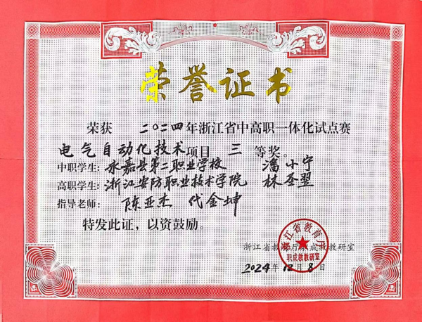 12月8日,2024年浙江省中高职一体化“电气自动化技术”赛项在温州市职业中等专业学校圆满落幕。永嘉县第二职业学校潘小宁(指导老师:陈亚杰)与浙江安防职业技术学院林圣翌(指导老师:代金坤)组队,经过激烈比拼,最终斩获三等奖。本次比赛由浙江省教育厅主办,以团体赛方式进行,每支参赛队由2名选手组成,中、高职选手各1名,对接有中高职一体化等合作办学的职业院校组队参赛。比赛内容依据浙江省电气自动化专业中高职一体化专业教学标准设置,包括电气控制线路设计与虚拟产线搭建、产线系统设计与仿真、系统功能联调、职业素养等,全面考查参赛选手的专业技能和综合素质。备赛期间,两校领导高度重视,专业部领导及先进制造业教研组全程紧密跟进,为师生给予了全方位、细致的指导与支持。尽管探索“线路搭建、程序编写、理论强化”的征程充满挑战,但潘小宁与林圣翌同学仍凭借其卓越的编程技艺与无间的团队协作,在激烈的竞赛中大放异彩,最终脱颖而出。此次获奖不仅是对潘小宁同学个人能力的肯定,也是对永嘉二职竞赛工作的肯定,学校将继续秉持“以赛促教、以赛促学”的教育教学理念,深化教育教学改革,创新人才培养模式,为学生给予更多展示自我、提升能力的机会和平台。