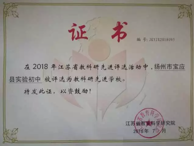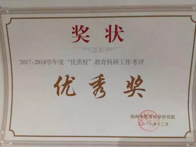 2018年12月23-25日,市“2018年度新课改学术论坛活动”在扬州皇冠假日酒店举行。颁奖环节,宝应实中获颁“2018年江苏省教科研先进学校”和“扬州市2017-2018学年度‘优质校’教育科研工作考评优秀奖”两项大奖。这是学校在取得扬州市“十三五”教育科研优质校的基础上,因教科研工作考核年年优秀,经省市教科院最终评定后,宝应实中取得的省市教科研大奖,为学校在省市评比中争得一席之地,教科研工作继续领跑扬州大市。