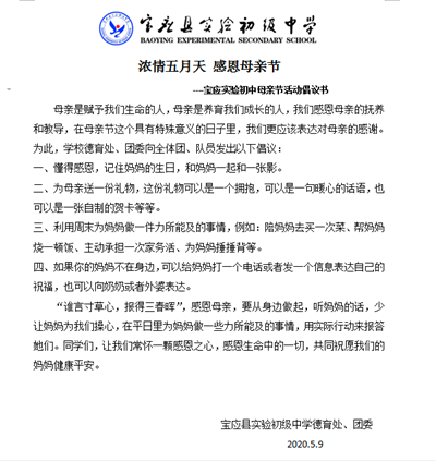“谁言寸草心,报得三春晖”,又一个“母亲节”如期而至。在这个特殊的日子里,宝应县实验初中德育处、团委向全校团、队员发出了一份倡议书,温馨提示同学们感怀母恩、珍惜当下。全校学生在母亲节这一天,持续行动,响应倡议,用各自的方式向妈妈表达了节日的祝福。孩子们有的帮妈妈捶背,有的帮妈妈做家务,有的自制了小礼物送给妈妈,还有很多同学在这个特别的日子里与妈妈留下一张合影。看着照片中妈妈们的笑容,相信她们一定感受到了孩子发自内心的感激和感恩。