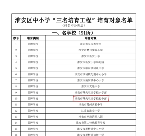 9月19日,淮安区教体局组织的“三名培育工程”培育对象进行公示,淮安曙光双语学校初中部成为“品牌学校”培育对象。徐爱华、李文婷等11位老师成为“教学名师”培育对象,范海燕、凌雷、纪以权等62位老师成为“教学能手”培育对象,崔明建、刘一松等20位老师成为“教坛新秀”培育对象。