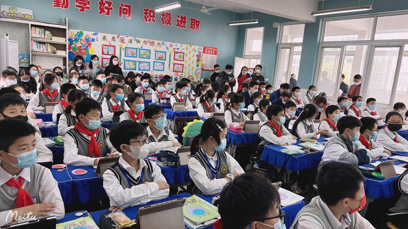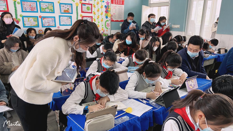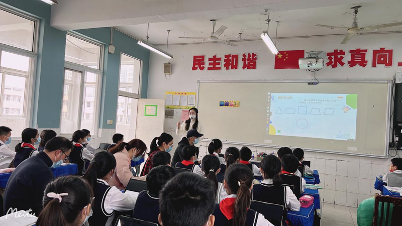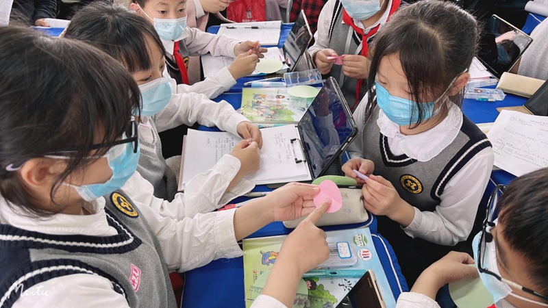 第一时间,本次教研活动由五年级数学组张雨晴老师进行课例展示《圆的认识》。本节课教学设计别具一格,体现了教学新理念,采用了教具和平板相结合的新方法,呈现出了新气象。教师从学生已有经验出发,先用手边物体画圆,分析优缺点,再自然引出圆规画圆,接着引导学生在“折一折”“画一画”“量一量”的小组探究活动中认识了圆的特征。整节课,教师注重引导学生自主探究、合作研讨,使学生掌握新知的同时又积累了学习方法,深刻体现了“5G融学课堂”的理念。