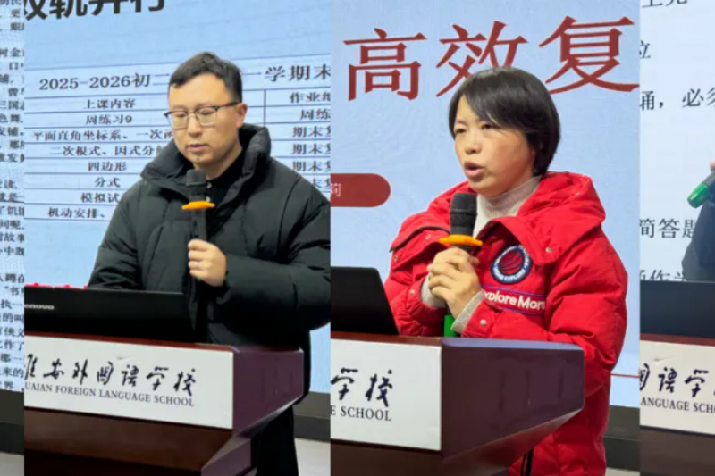 三个级部备考会统一思路、压实责任,全校教师将落细分层教学、靶向复习等策略,师生同心冲刺期末,力争再创淮外教学新佳绩。