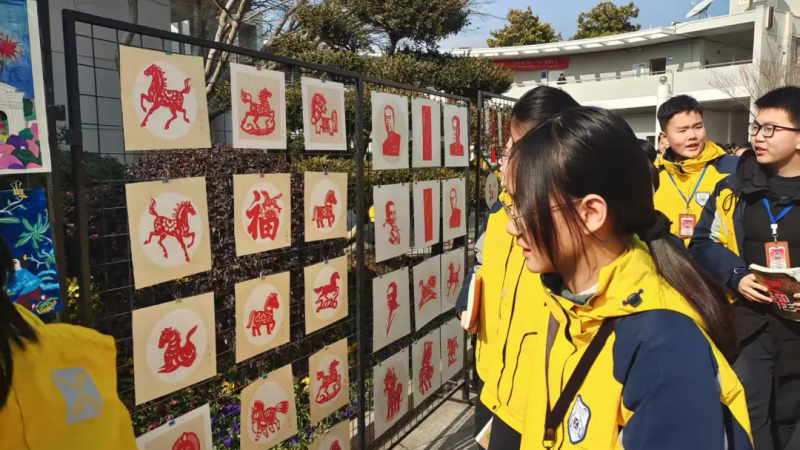 剪纸展区的红纸上,奔马昂首扬蹄,鬃毛飞扬的线条里满是奔赴新春的灵动;圆润饱满的“福”字透着喜庆;还有鲜活的人物剪影……一把剪刀、一张红纸,同学们让非遗剪纸与马年新春撞了个满怀,每道纹路里都藏着对新年的期许。