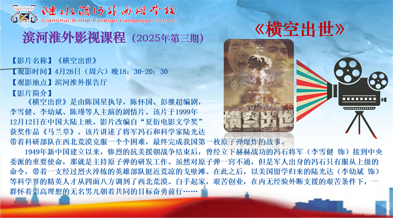 春末夏初,涟水滨河外国语学校的校园里,海棠花影与青春理想交相辉映。4月26日晚,滨河淮外第三期影视课程《横空出世》在报告厅隆重启幕。本次课程以“信仰·奋斗·担当”为主题,将红色基因融入青春血脉,以光影为媒,为滨河淮外学子们打造了一堂沉浸式思政大课。
