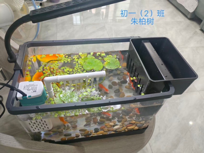 为深化“双减”政策下的实践育人成效,国庆假期期间,学生动手设计与制作了水族箱和生态瓶。“小生态瓶”承载“大科研观”,将生物与生活融为一体,吸引了七、八年级学生的热情参与。顺利获得该活动,学生进一步理解水生生态系统的基本构成,培养动手操作、解决问题的能力及持续养护的责任心,激发对自然科研的兴趣,增强热爱生命、保护环境的意识,体验创造的乐趣。