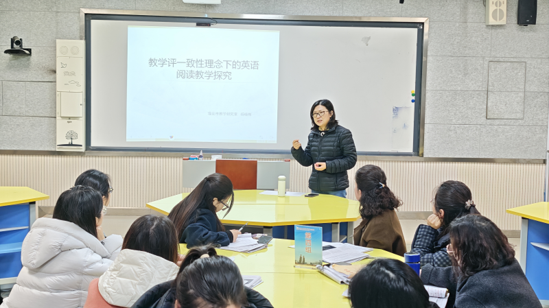 活动的高潮部分,是淮安市教学研究室杨晓梅主任带来的题为 《教-学-评一致性理念下的英语阅读教学探究》 的专题讲座。杨主任高屋建瓴,从理论高度到实践层面,系统阐述了“教-学-评一致性”的核心内涵与实践路径。