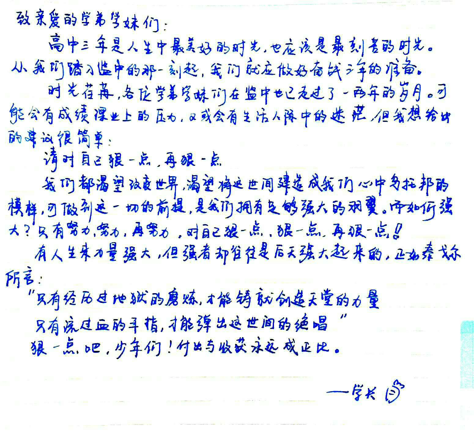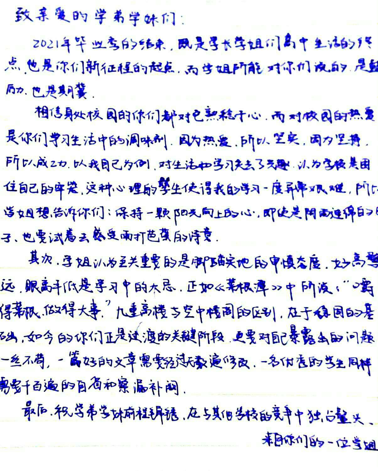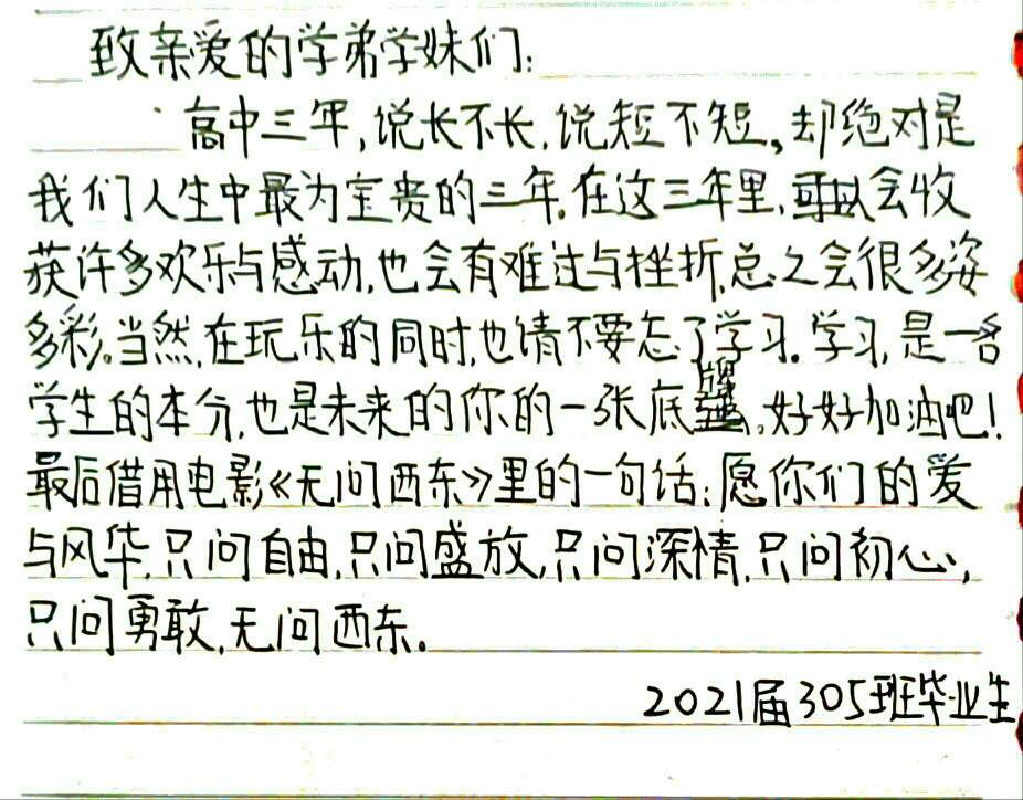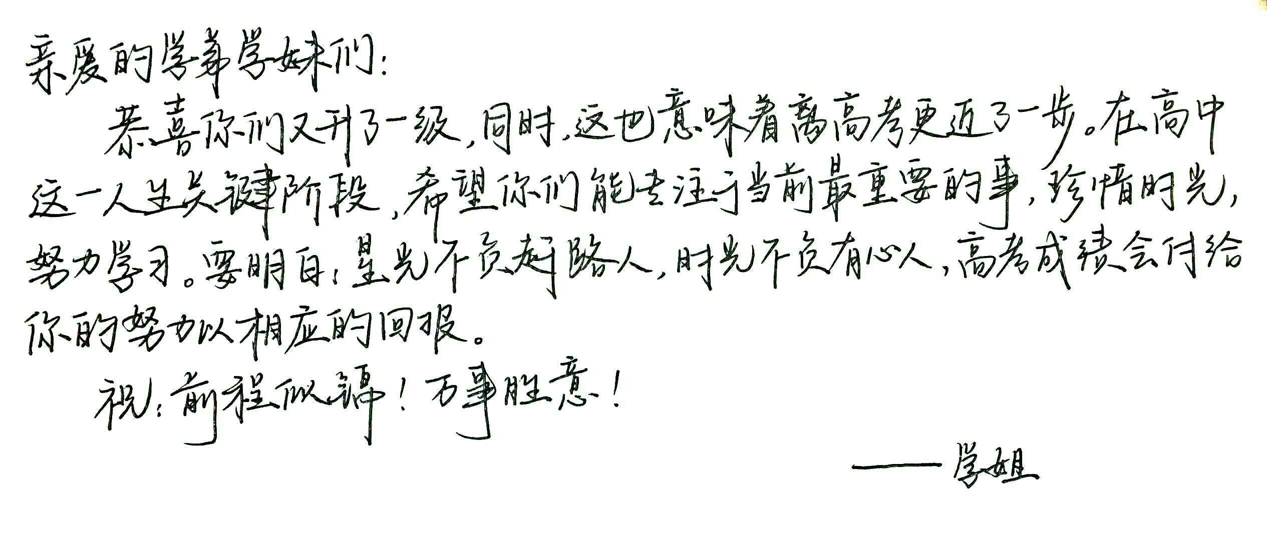 学弟学妹们,如今的我们将要远航,再回眸,目光所及处,是即将怒放的你们,这一封封手写的箴言,诸位请亲启啊!