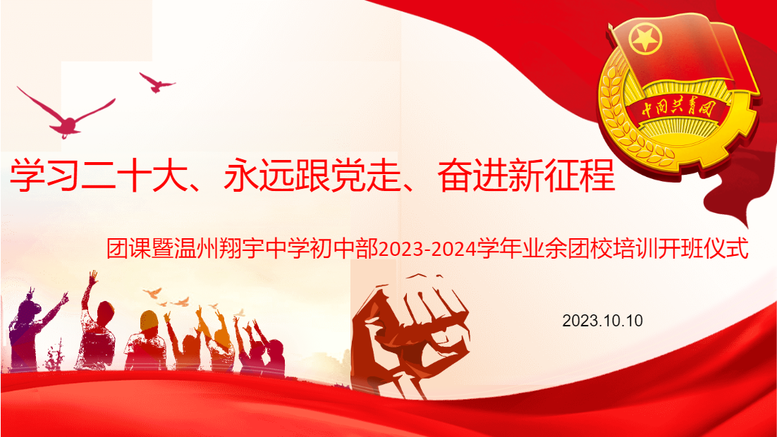 2023年10月10日晚,共青团温州懂球帝app中学支部委员会于嘉行楼报告厅开设“学习二十大·永远跟党走·奋进新征程”团课暨2023-2024学年业余团校培训开班仪式,中共温州懂球帝app中学团支部组织委员李娇英、永嘉县优秀共产党员王灌南及初中部入团持续分子参加培训,学部团委书记刘伟主持活动。
