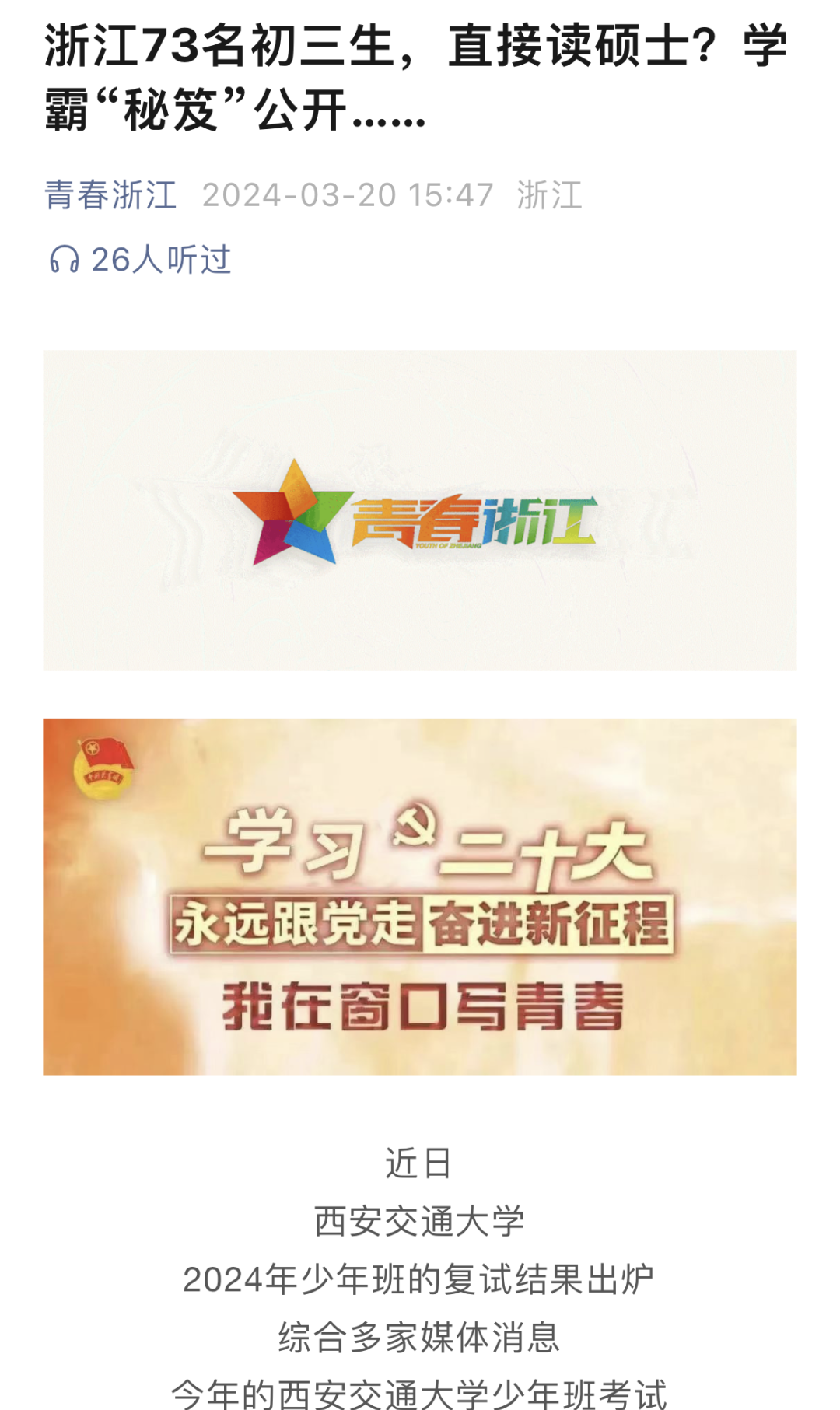 3月20日,共青团浙江省委官方澎湃号发布《浙江73名初三生,直接读硕士?学霸“秘笈”公开……》一文,并同步在《青春浙江》公众号发布。
