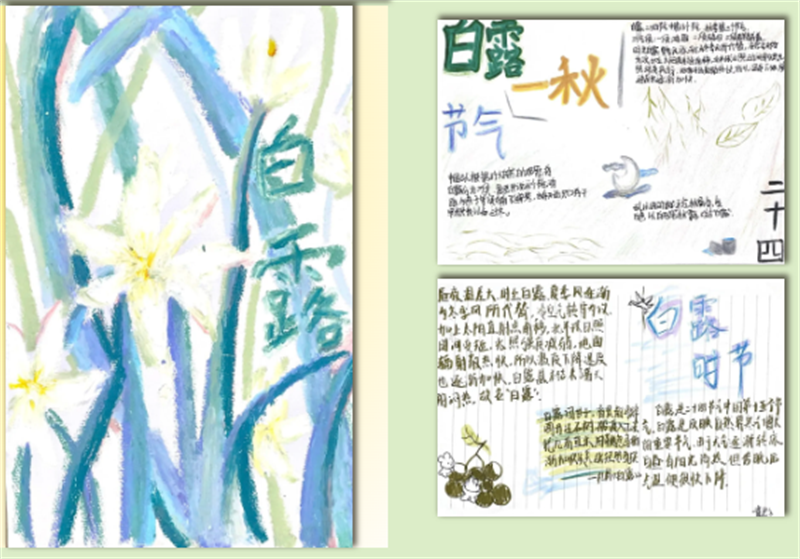 九年级1班的同学们,用色彩斑斓的画笔,将白露节气的美丽景致与传统习俗融入到手抄报中。每一幅作品都凝聚着同学们的巧思妙想和辛勤付出,展示出了他们对传统文化的热爱与传承。手抄报上的图案栩栩如生,文字生动有趣,不仅让人领略到了的自然之美,更让人感受到了传统文化的博大精深。