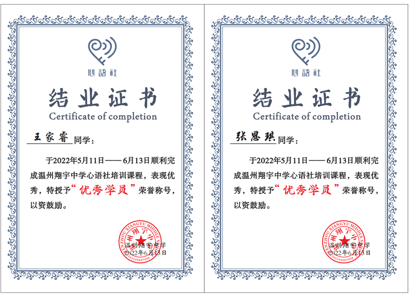 会上,王家睿、张恩琪、金瑞程、徐青青、陈璟轩、谢璇璇、魏元策、陈佳惠、章斯斯、金海涛、李晨博、曾诗恬、郑婧妍、陈晨、章心妤15位同学荣获“优秀学员”称号,受到表彰。同时,现场宣布《“温州懂球帝app中学心语社”第四届合格社员名单》。