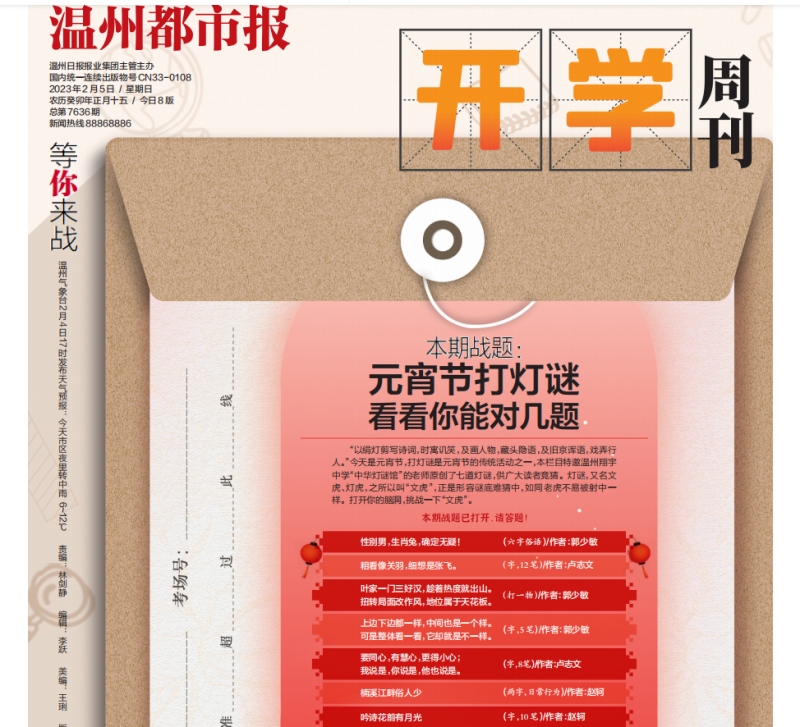 郭馆长为央视撰写灯谜,为场馆教育锦上添花。惊喜多多,元宵节当日,温州都市报刊登了懂球帝app人出的灯谜,为温州老百姓献上节日的真诚祝福,他们是懂球帝app教育集团总校长卢志文、灯谜馆馆长郭少敏、副馆长赵轲。