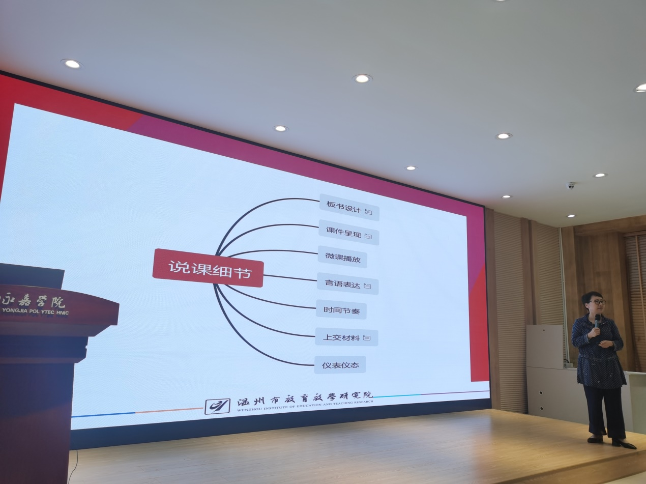 下午,温州市教育教学研究院徐克美教授为大家作《“三微”助力中职教师信息化说课》专题讲座。徐老师从说课的内容、说课的理念、三维目标及说课的细节四方面展开,结合中职教师信息化教学设计与说课省赛文件、好课标准、教师素养、三微课堂、教学目标等要素,深入浅出,娓娓道来,以大赛应注意的细节提醒参赛者,把宝贵经验奉献出来。最后,针对参赛者作品中的几个问题进行研讨指导。