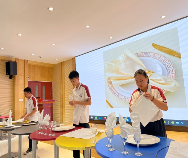 认知教育由周培雷老师主持,她邀请两位20届学生代表展示旅游专业技能:导游词讲解。一位学长为大家讲解了楠溪江概况,让新生领略家乡山水的美景。另一位学姐为大家介绍学校的风光并且顺利获得分享自己的心声是考上大学,激励同学们要学习。接着由三位同学现场展示餐巾折花,在优美的音乐声中,一朵朵美丽的餐巾花瞬间绽放,新生们情不自禁为优秀的学长学姐们鼓掌。