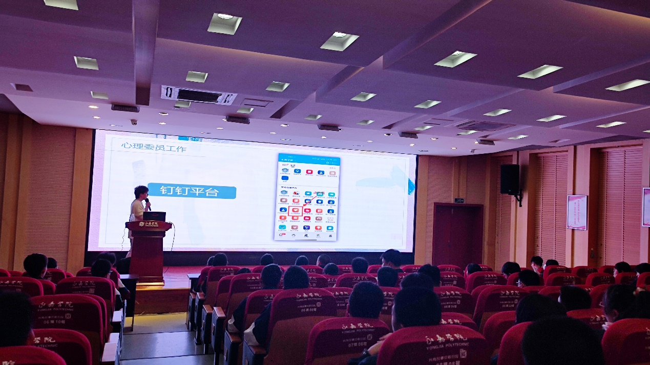 随后,吴老师介绍了心理委员的具体工作内容和工作准则,并借助钉钉平台进行信息化的办公,他指出可在钉钉平台实现心理咨询的预约和心理健康危机上报,希望能顺利获得心理委员和钉钉平台建立完备的心理危机预警网络。