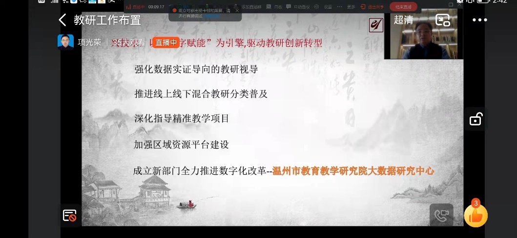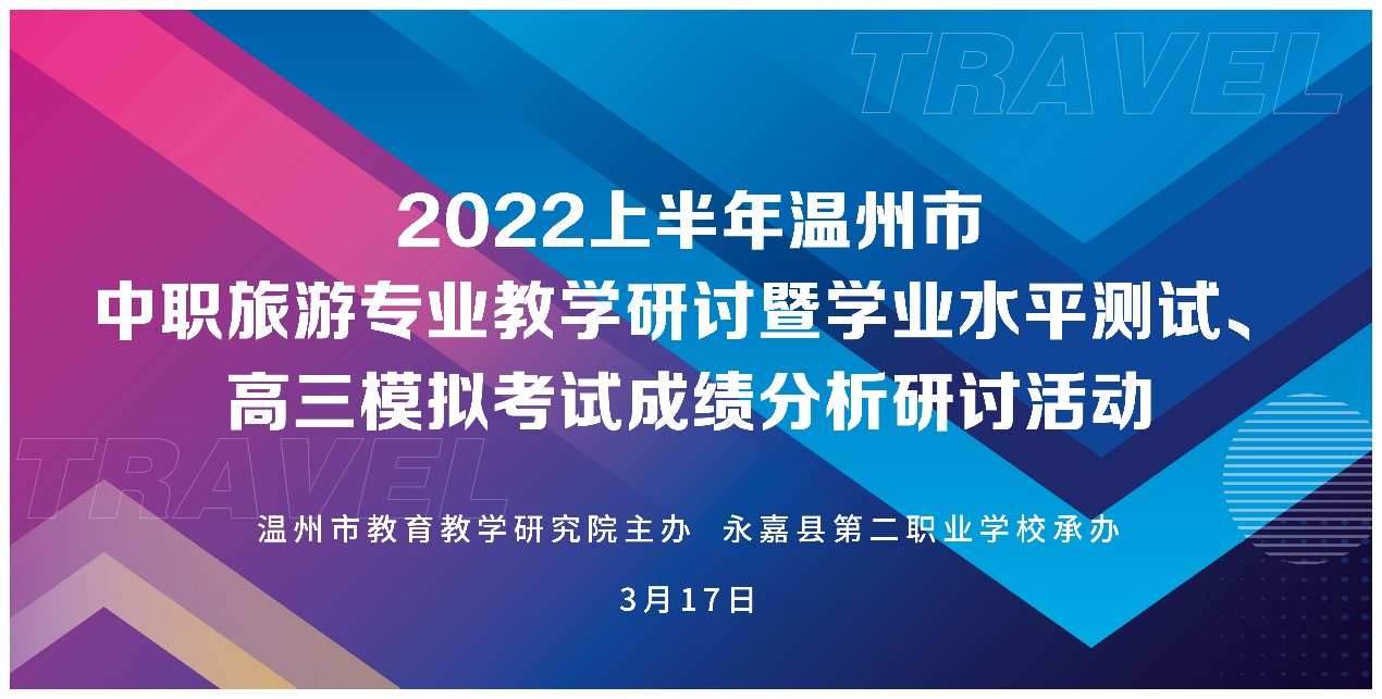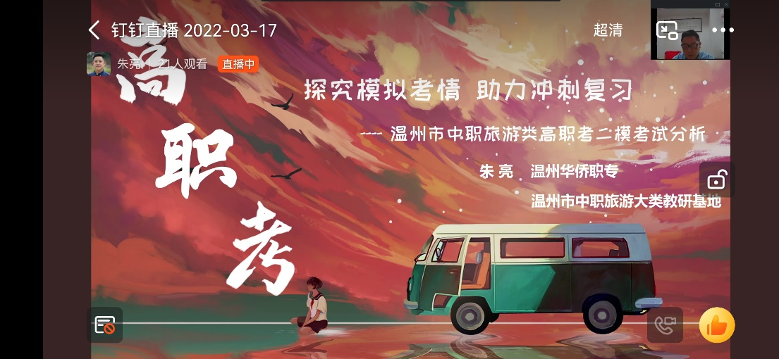 2022年3月17日上午,温州市中职旅游专业教学研讨暨学业水平测试、高三模拟考试成绩分析研讨活动在线上举行,本次线上活动由温州市教育教学研究院主办,永嘉县第二职业学校承办。本次活动在温州市旅游专业教研员项光荣老师的主持下,以温州市中职旅游教师钉钉群为网络直播载体,各(县、市)相关教研员、全市中职旅游专业教研组长、骨干教师、市中职旅游大类专业教育教研基地成员(旅游专业)、市中职历史和现代服务类专业“三教”改革研修班旅游专业学员共同参加。