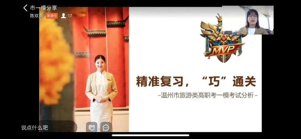龙湾职业技术学校的陈双双老师针对温州市高职考一模召开了《精准复习“巧”通关——温州市中职旅游类高职考一模考试分析》专题讲座。讲座中陈老师从出题理念、成绩分析、复习攻略三方面对市一模考试情况进行分享。陈老师借助大数据,提出下一阶段的复习任务应注重学生学习习惯的养成、知识点查漏补缺能力的培养以及学生备考心理的关注。