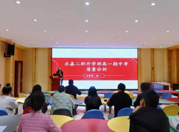 11月23日下午,永嘉县第二职业学校升学部在和空间一楼教师开展中心召开了高一期中考试质量分析会。会议由卢窈颖老师主持,学院管理顾问韦恒教授、升学部邵泉取主任、姜涛副主任出席,郑微微段长助理以及升学部高一全体教师参加会议。