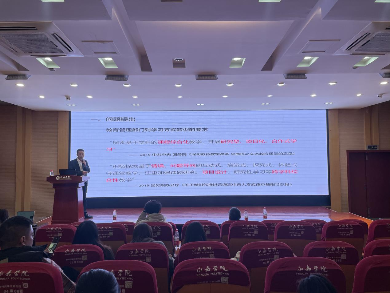 随后,戴建法老师就《中职PBL案例设计与课堂教学》作专题讲座。他从背景与意义、PBL基本理论、PBL案例设计、PBL课堂教学、PBL学习资源五个方面做了分享。他认为项目化学习意义在于:一是基于情境,项目驱动;二是合作探究,多方联合;三是综合知识、协调项目。同时,戴老师又生动详实地介绍了项目化学习的具体实施流程与参考方案,讲述了PBL基本流程:选定项目、制定计划、活动探究、项目完成、成果研讨、活动评价。最后他以“项目源于生活,知识反哺实践:项目化学习加强教学与生活的联系,应该让教育从生活中来,到生活中去!”结束了本次讲座。