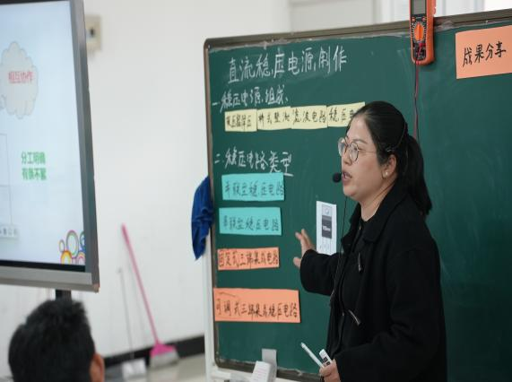 本次活动分为公开课展示和专题讲座。在公开课环节,周冬微执教《直流稳压电源的制作》一节,以制作直流9V的稳压电源为项目,顺利获得项现在期的准备,资料的查找,小组分工和电路图设计为本堂课实行准备,创设情境引入项目。在项目实施过程中,周老师设计了两项任务:画结构,为更好制作电路实行铺垫;改设计,接电路。周老师顺利获得角色扮演工程师和技术师,让学生用仿真软件修改参数进行仿真,突破教学的难点。同时,装配师和检测师一起安装电路,小组共同对装好电路再次进行元件更换,增加电路功能,经过调试和测量数据完成制作。最后四个小组代表进行成果分享,展示作品。