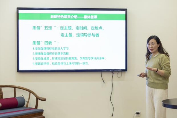 接着罗丽华老师分享了临平职高的教研特色项目——集体备课。临平职高的集备宗旨是“语文学科核心素养与课程目标”,集备内容是“备学生、备教材、备教法”,集备定主题、定时间、定地点、定主备、定领导参与者。罗老师的分享给我们指明了集体备课的方向。
