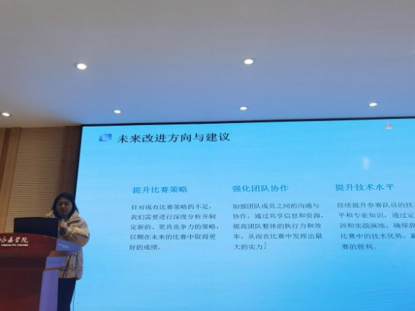 专业部主任周芳深入剖析了模拟比赛中的各项数据,包括得分、失分、命中率等关键指标,用科研数据说明各竞赛队伍的优势和不足,对参赛者的表现进行了全面分析。她针对参赛者在模拟比赛中的表现提出了宝贵建议,并在提升比赛策略、强化团队协作、提升技术水平三个方面给予了具有建设性的方案。