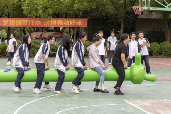 运动会进行时:精彩纷呈,欢乐无限 运动会现场,一幕幕激动人心的瞬间令人难忘。从“一圈到底”的灵活传递,到“夹球运输”的默契配合;从“企鹅漫步”的憨态可掬,到“击鼓接力”的速度与激情;再到“能量传输”的精准无误和“竞速毛毛虫”的团队协作,每一项比赛都充满了趣味和挑战。最激动人心的莫过于“竞速毛毛虫”比赛了。各班队伍精神抖擞、蓄势待发。随着裁判员一声令下,各队队员紧握把手、齐心协力向前冲刺。竞争异常激烈,观众们的加油助威声此起彼伏。专业部主任周芳也参与其中与学生们共同享受运动的乐趣。