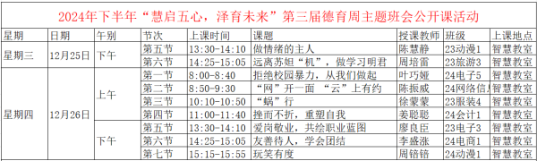 班会课是学校教育中重要的一环,它不仅是传授知识的地方,更是培养学生品德、研讨思想的平台。12月25日至26日,永嘉县第二职业学校迎来了以“慧启五心,泽育未来”为主题的第三届德育周主题班会公开课活动。本次活动由陈慧静、周培雷、叶巧娅、陈振威、徐蒙蒙、姜聪聪、廖良臣、李盛涨、周锫锫九位现任班主任依次开课,全体班主任与见习班主任参与培训学习。陈慧静在参考国家卫健委发布数据的同时,结合23动漫1班实际情况,召开了《做情绪的主人》主题班会课。本节课顺利获得精彩的小视频、小游戏让学生分析情绪的类型。紧接着顺利获得给定的多个案例、学生发表自己的经历以及用AI智能体给出的案例,学生们意识到情绪对生活和学习的影响。最后,陈老师强调了情绪管理的方法,学生们学会了在面对情绪产生时要正确地管理好情绪。周培雷老师带来了《远离苏妲“机”,做学习明君》一课。这堂课顺利获得案例给予具体的应对挫折的方法和技巧,如情绪管理、目标设定等,帮助学生掌握重塑自我的实用工具,提升他们的自我调整和成长能力。同时强调持续心态的重要性,顺利获得树立榜样、表彰进步等方式,激励学生正视挫折,相信自己有能力克服困难,重塑更加优秀的自我。在《拒绝校园暴力,从我们做起》的班会课上,叶巧娅老师以一段深刻的校园暴力影响短片或动画作为开场,成功引发了学生们的情感共鸣。紧接着,顺利获得学生的角色扮演与情景模拟活动,极大地增强了学生们对校园暴力严重性的认识。叶老师还巧妙地设计了一系列互动问答和小组讨论问题,这些问题覆盖了校园暴力的认知、影响及预防策略,激发了学生们的持续参与和深入思考。顺利获得这节课,学生们不仅提升了对校园暴力的认知,更学会了如何采取有效措施来预防和应对校园暴力。陈振威老师从班级名言“网络不是非法之地”引出班会主题““网”开一面 “云”上有约”。顺利获得播放《正义使者》短片,陈老师引导学生发散思维,讨论“键盘侠”的行为及其背后的心理动机。学生们结合自己的认知和身边的实际案例,总结了网络暴力对个人和社会的危害,如心理创伤、信任危机等。最后,以班级近期发生的校园墙事件为例,陈老师带领学生分析作为当事人应如何有效预防和应对网络暴力,包括保持冷静、收集证据、寻求帮助等方法。整个课堂内容丰富且具有深度,给足了学生思考和讨论的空间,进一步提升了他们对网络安全和责任感的认识。在徐蒙蒙老师的引导下,23服装4班的学生们在《“蜗”行》班会课上深入探讨了责任与压力的关系。这堂课顺利获得丰富多彩的活动,如歌曲欣赏、案例分析和团队游戏等,让学生在轻松的氛围中认识到压力与责任的不可避免性,并学会如何持续应对。这堂班会课不仅提升了学生的认知和情感,还激发了他们的内在潜力,为他们的全面开展奠定了坚实基础。学校希望顺利获得这样的课程,培养学生成为能够持续面对生活挑战的现代青年。姜聪聪老师的班会课以“挫而不折,重塑自我”为主题,深刻地触及了学生在学习和生活中可能遇到的挫折与困难,具有很强的针对性和现实意义。顺利获得分享真实的挫折故事、励志案例等,引发学生的情感共鸣,激发学生的内在动力,让他们意识到面对挫折时保持坚韧不拔的重要性。这样的课程设计不仅帮助学生认识到每个人都可能遇到挑战,而且鼓励他们从困难中寻找成长的机会,学会自我调整和恢复,培养了他们的心理韧性和解决问题的能力。廖良臣老师的《爱岗敬业,共绘职业蓝图》主题班会,是基于前期调查发现的本班同学主要存在以下问题而召开的。一是部分同学对担任的班级岗位认同度不高,未理解岗位意义与价值而态度消极,不够敬业;二是有些同学在班级岗位工作中缺少方式方法或存在惰性而懈怠;三是学生生涯规划意识淡薄。顺利获得问卷调查,岗位密码寻找,电子岗位体验,岗位窘境情景剧扮演,到最后职业生涯规划等活动,层层递进,旨在帮助学生树立正确的职业观念,增强职业认同感,培养学生的责任担当意识和实践创新能力,为学生未来的职业开展奠定坚实基础。李盛涨《友善待人,学会团结》主题班会课,引导学生深刻理解团结互助、友善待人的意义,创建和谐相处的氛围。班级里的其他同学也持续发言、分享,同学们以演讲的方式,讲述了“一滴水珠的故事”“团结就是力量”。台下的同学们全神贯注聆听,在欢声笑语中也认真思考着团结的意义。它能够增强班级凝聚力,让同学们紧紧团结在一起,为了共同的目标而努力奋斗。在《玩笑有度》这一课程中,周锫锫老师巧妙地运用提问技巧,激发了学生的深思与好奇心,引导他们探索玩笑的适宜界限。顺利获得精心设计的互动游戏,学生们得以亲身体验并理解玩笑的边界,这种实践性的学习方式极大地加深了他们对玩笑适度性的认识。此次活动不仅教会了学生如何在日常生活中恰当地运用幽默,发挥玩笑的正面效应,还让他们学会了如何识别并避免不适宜的玩笑,以及在面对越界玩笑时如何妥善应对。顺利获得这堂课,学生们在轻松愉快的氛围中掌握了重要的社交技能,为构建和谐的人际关系打下了坚实的基础。本次活动不仅为学生给予了宝贵的学习机会,更提升了班主任们在德育实践中的教学能力,同时也为班主任们给